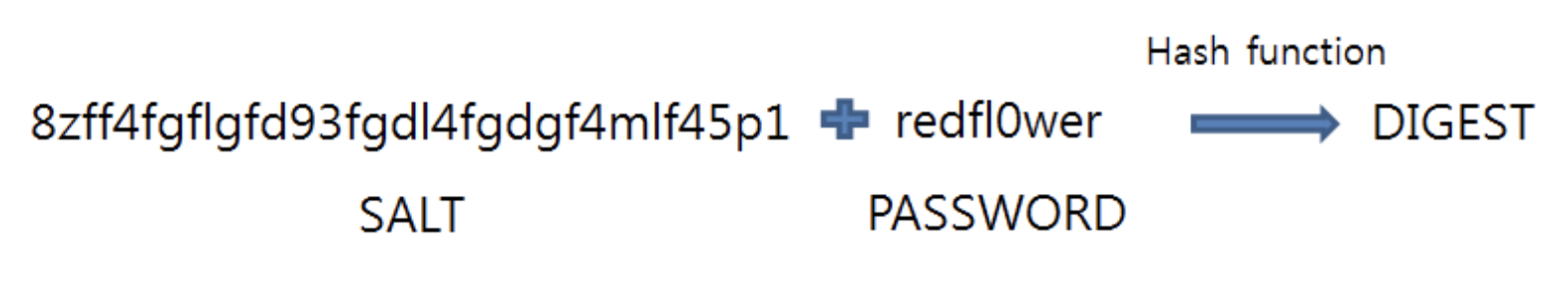 패스워드에 salt를 추가한 문자열 전체를 해쉬 함수를 통해 다이제스트를 생성한다.