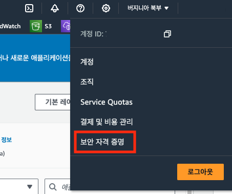 콘솔에서 상단 계정을 클릭 -> 보안 자격 증명 페이지로 접속합니다.