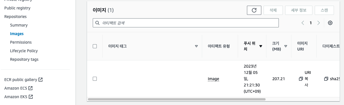성공적으로 완료가 되었다면, ECR에서 업로드된 이미지를 확인하실 수 있습니다.