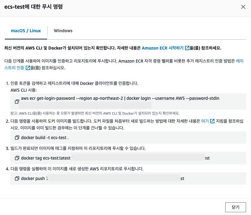첫 번째 명령어는 본인의 자격증명을 통해 AWS 리포지토리에 로그인 하는 명령어입니다. 그대로 복사하셔서 터미널에서 실행해주세요.
