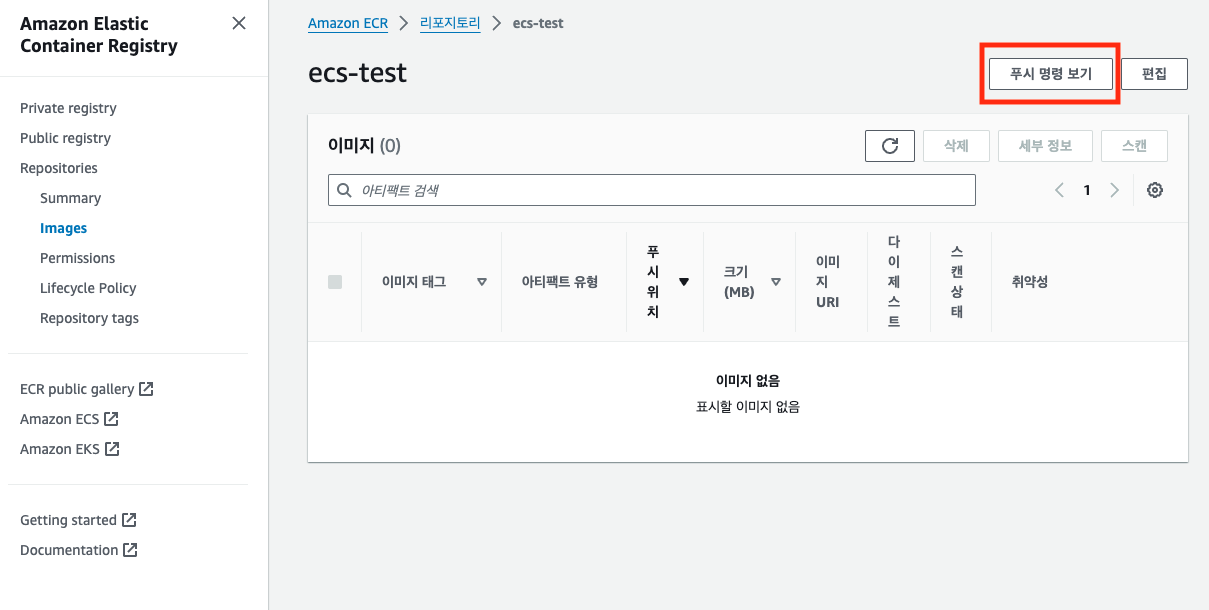 여기서 이미지를 푸시할 수 있는 명령어를 확인할 수 있습니다.