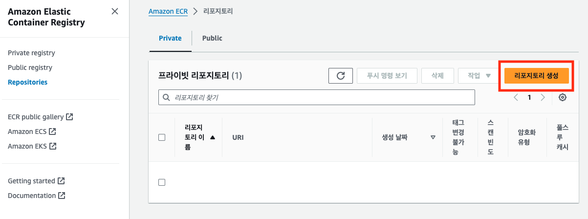 특별히 설정할 것은 없으니 어떠한 레지스트리든 하나 생성해주세요. 저는 private repository를 사용할 예정입니다.