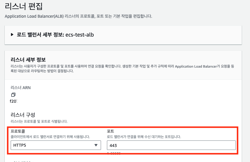 리스너 구성에서 HTTP를 HTTPS로 바꿔줍니다.