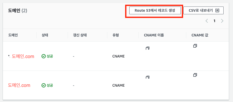 인증서의 상세 정보에 들어가서, 도메인의 Route53에서 레코드 생성을 해줍니다.