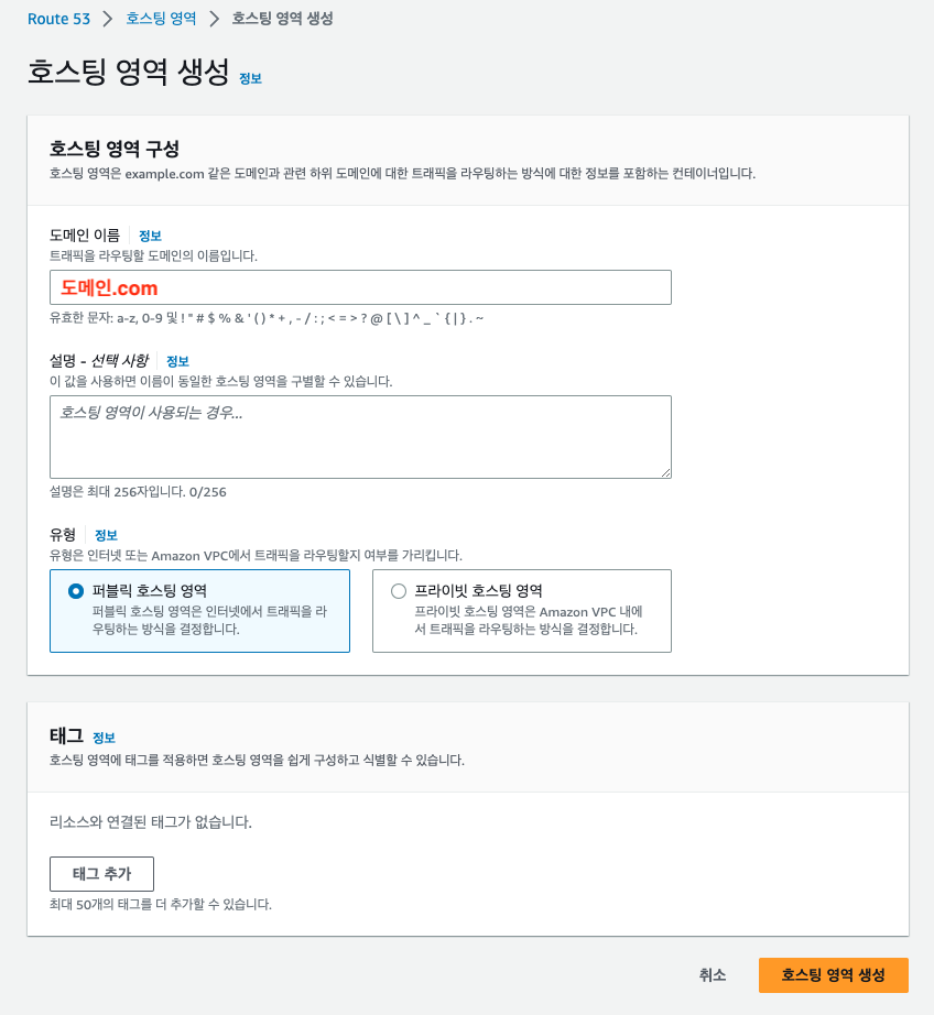 AWS Route53에 접속합니다. 호스팅 영역을 생성해주세요.