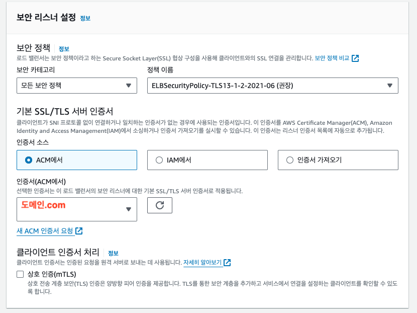 보안 리스너 설정 섹션에서 아까 발급 받은 인증서를 선택해주세요.