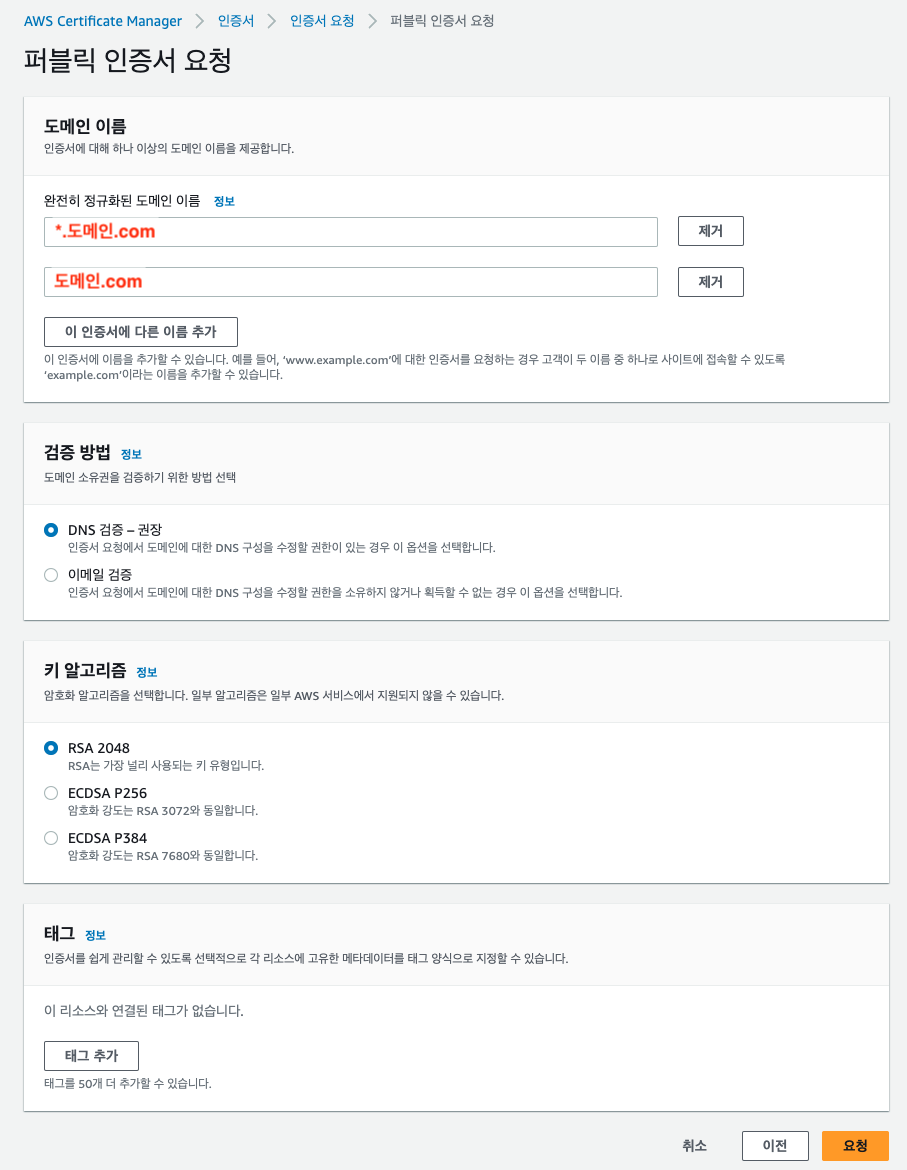 퍼블릭 인증서로 요청하시고, 도메인 이름을 작성해줍니다.
