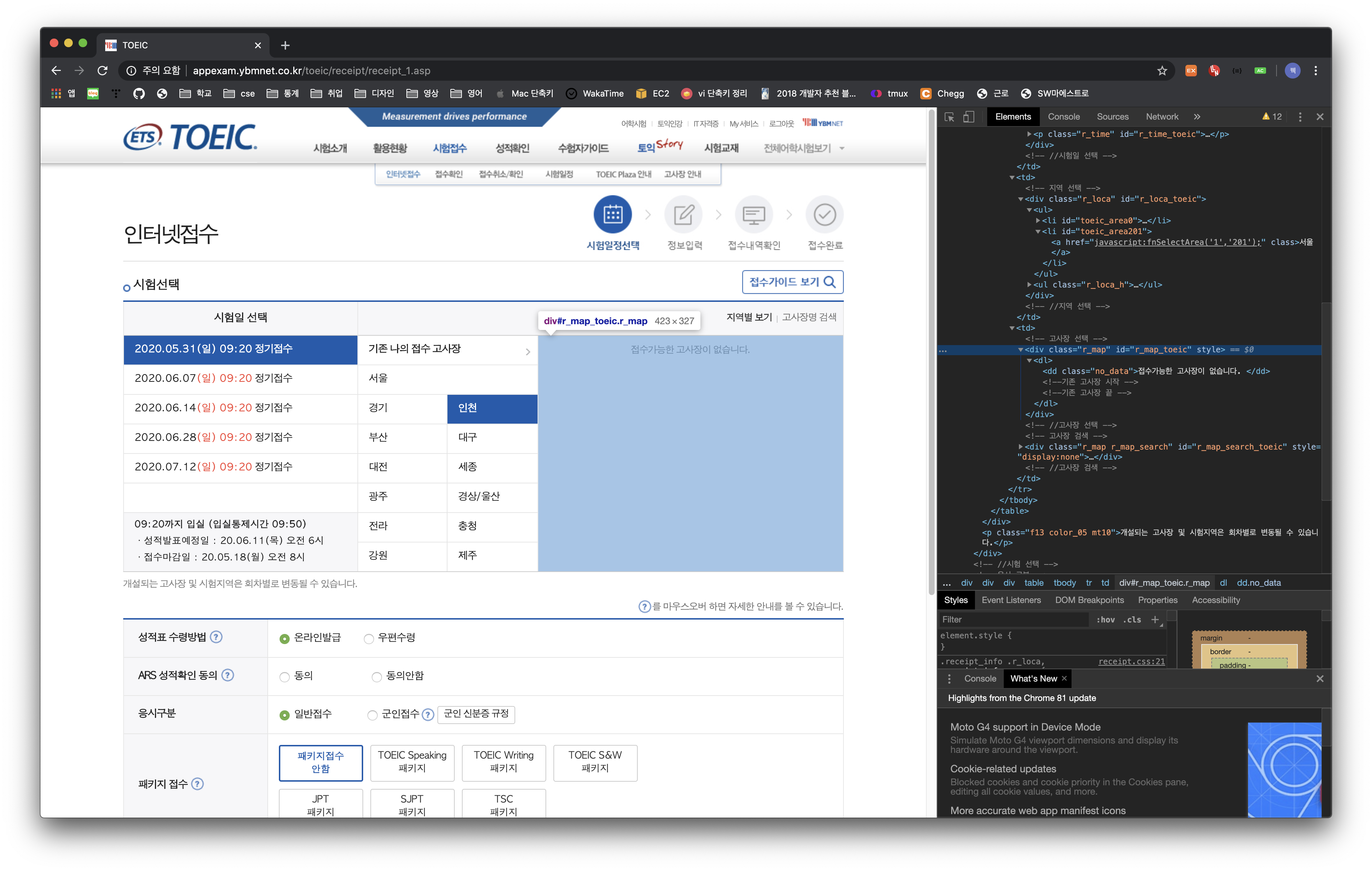 나는 현 시점에서 제일 최근의 접수장을 선택할 것이다. 그 첫 번째 선택지의 id는 toeic_time405이다. 같은 방식으로 지역을 선택한다. 서울의 경우 id값이 toeic_area201이다.