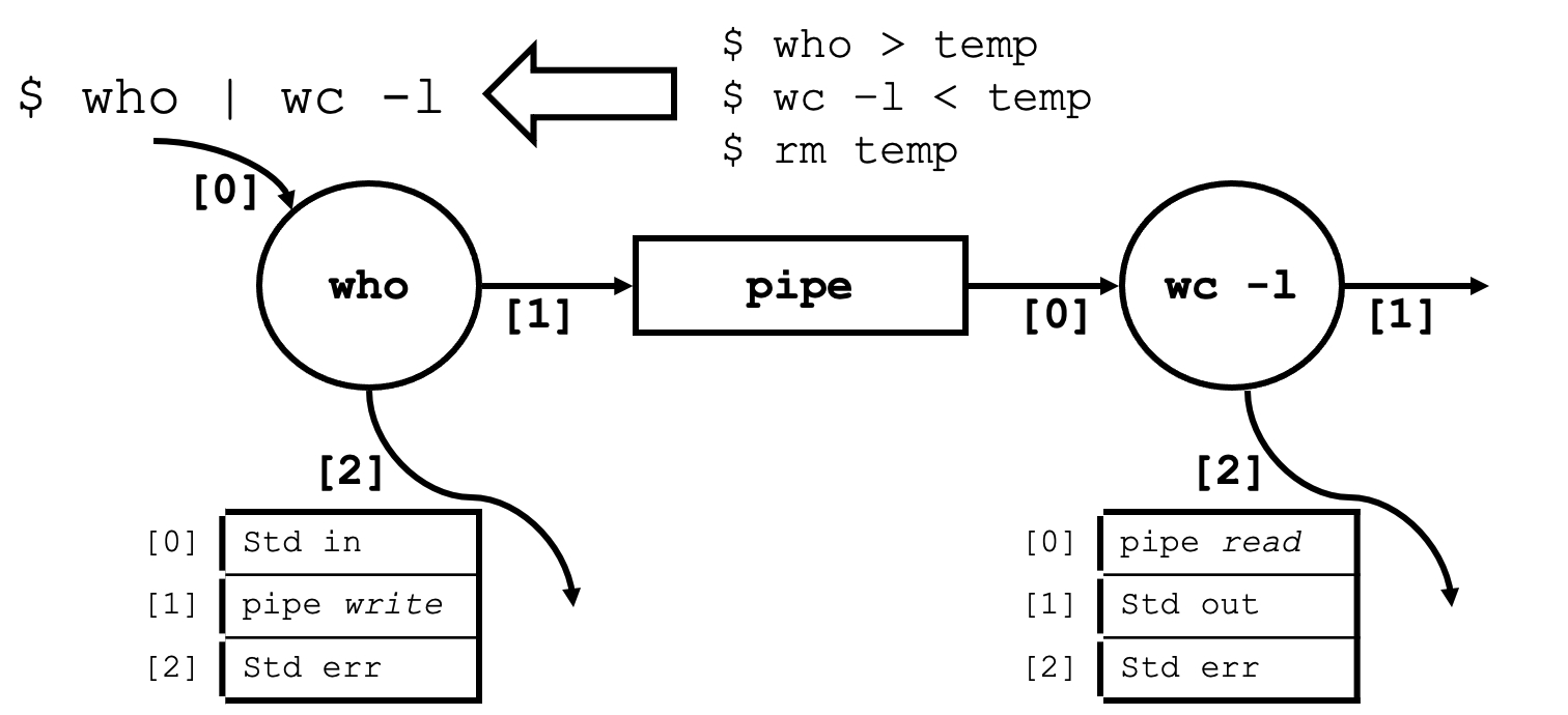 - who 명령어의 standard output이 pipe write로 변경됨